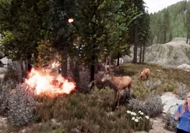 In the video, presenter Stephanie Abrams is shown standing on a similar circular platform seen in the storm video. Surrounded by the computer-generated forest and wildlife, Abrams explains how 80 percent of fires start from human activity, with embers from a campfire or a tossed cigarette leading to widespread devastation.